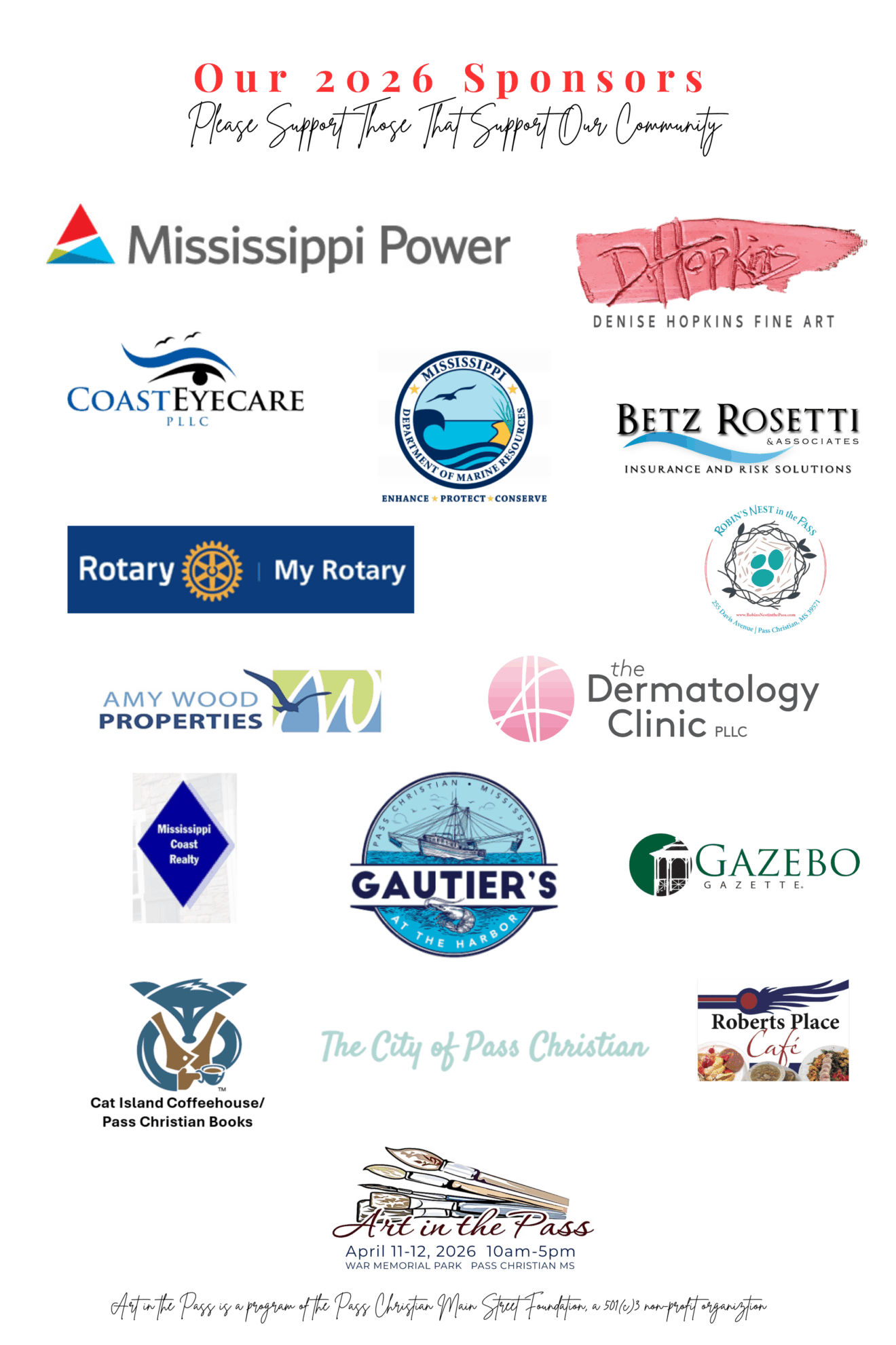 Art in the Pass would not be possible without the generous support of our individual sponsors. Your contributions help fund artist awards, student scholarships, community grants, and the many details that make the festival a success year after year. Thank you for investing in local art, education, and the creative spirit of Pass Christian.